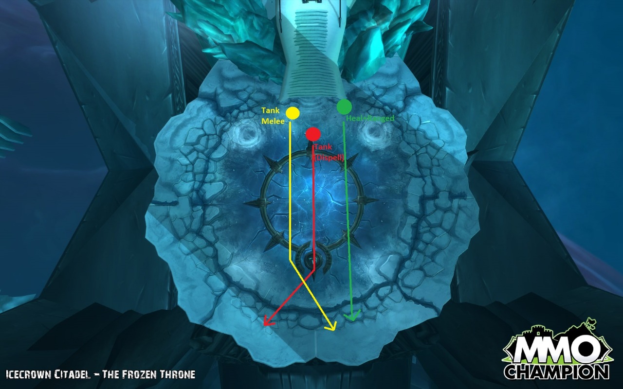 Raid sa rozdelí na 3 skupiny, 1. Melee+Tank, ktorý berie LK, 2. Tank s horormi, ku ktorému sa chodí raid dispellovať, 3. Ranged+healery. Počiatočné pozície týchto skupín sú na obrázku. Týmto rozostavením vytvorí raid trojuholník a je veľmi dôležité aby sa takýto trojuholník dodržiaval počas celej 1.fázy, aby stíhal každý v raide do 5s odbehnúť s necroticou a aby počas celej fázy mali healery a ranged v dosahu Tanka a LK.